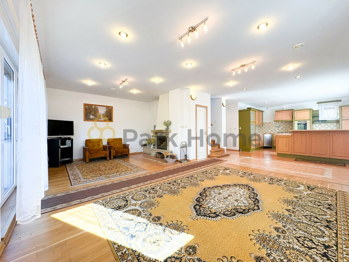 przestronny salon z kominkiem oraz systemem rozprowadzania ciepła na piętro