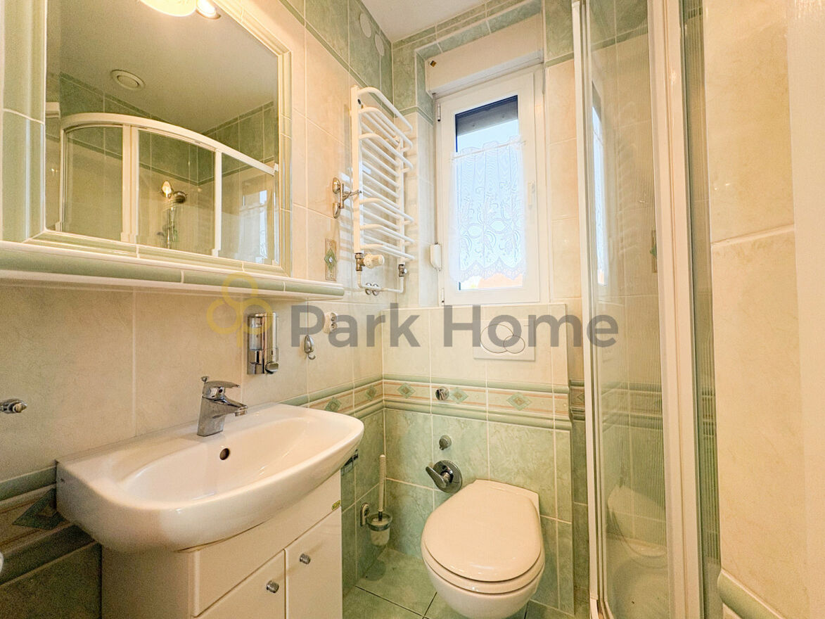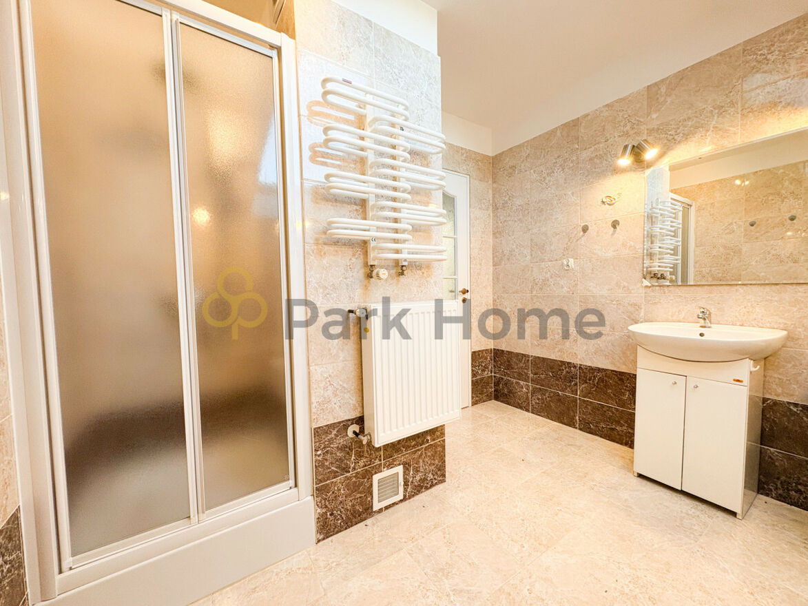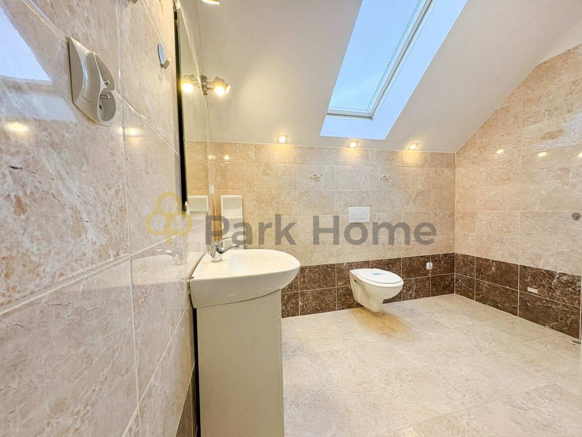 przestronna łazienka z prysznicem, WC oraz dużym oknem dachowym zapewniającym naturalne doświetlenie